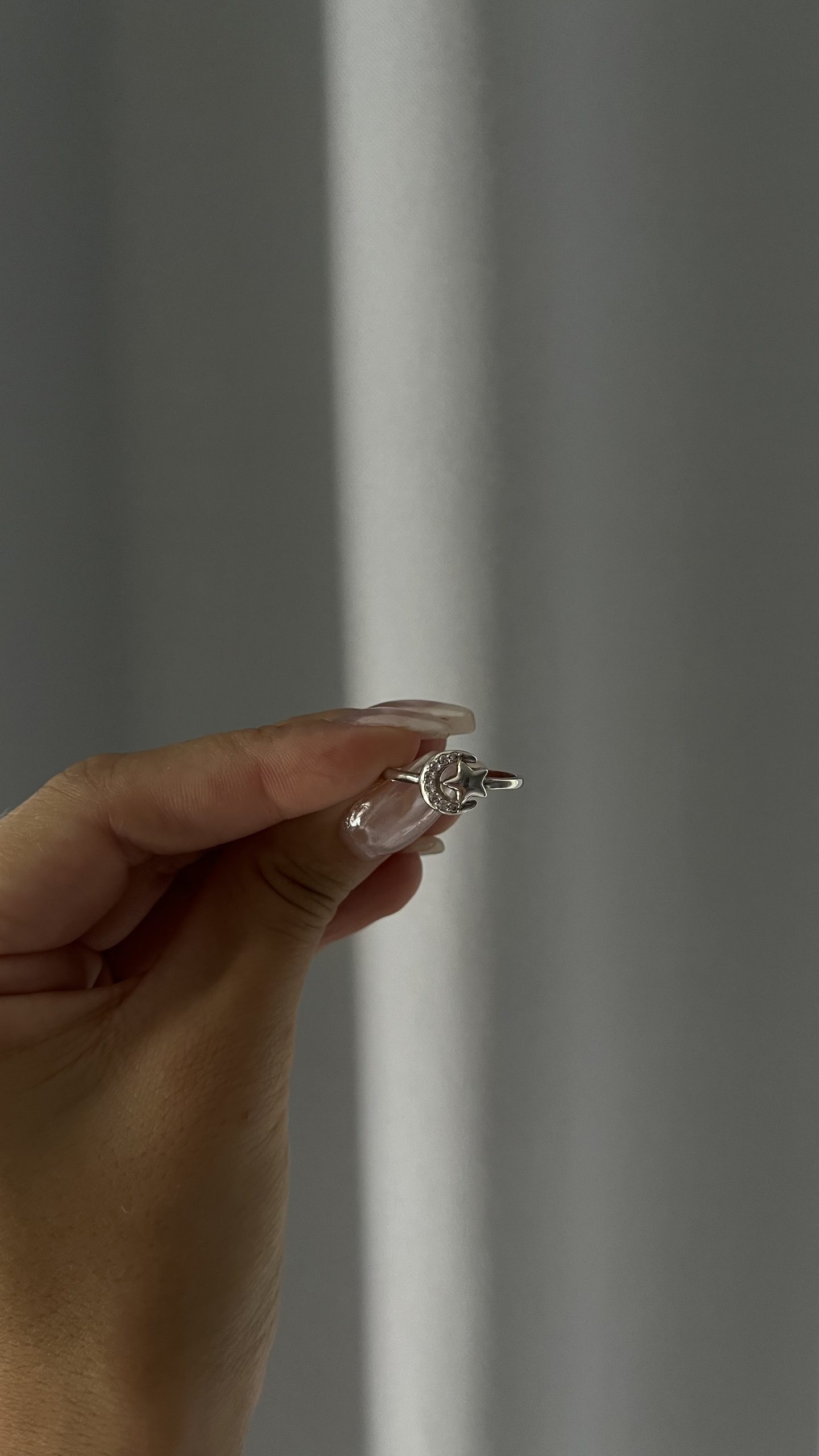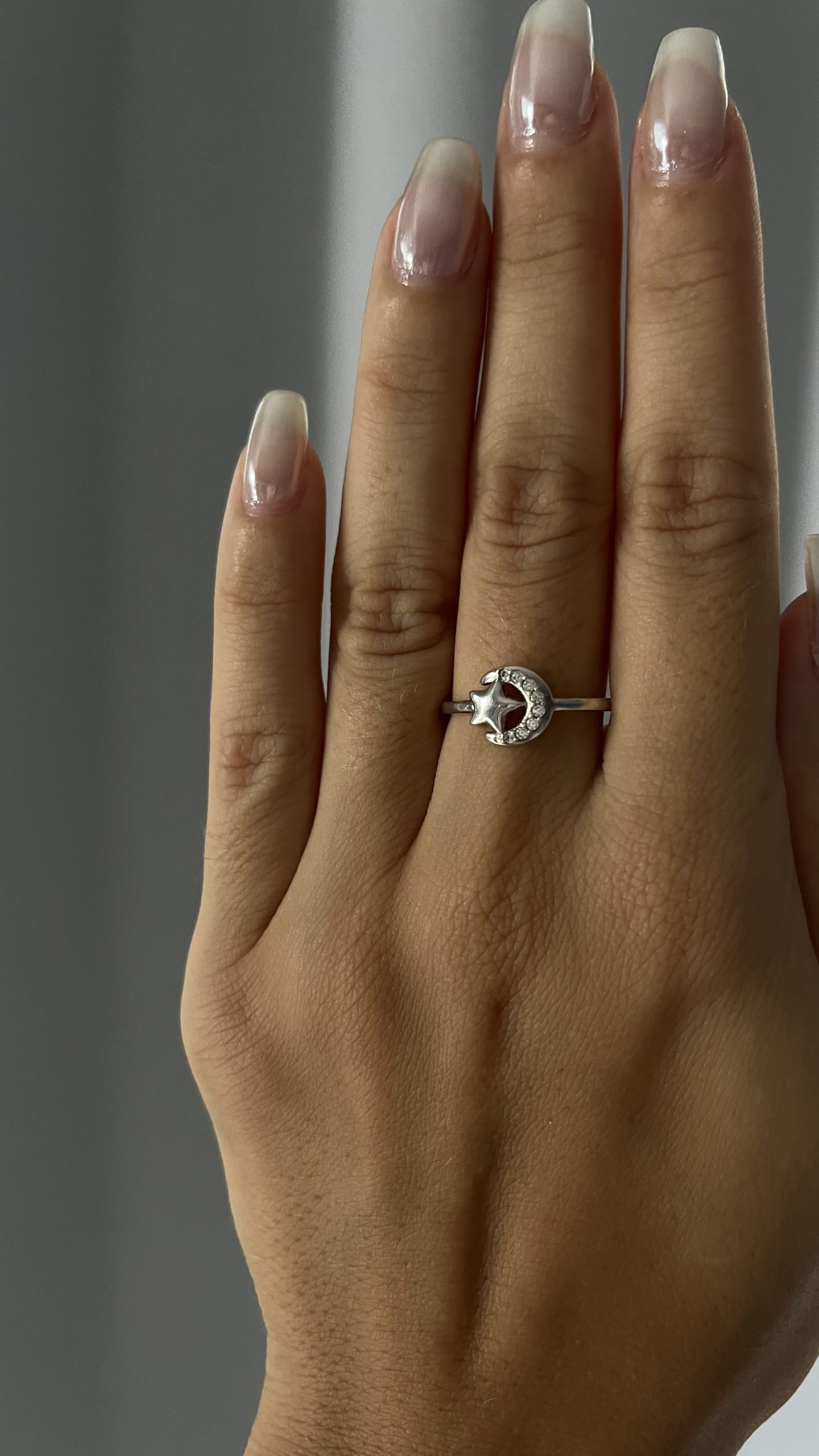 Anel Prata 925 Meia Lua Cravejada com Estrela Lisa n° 19